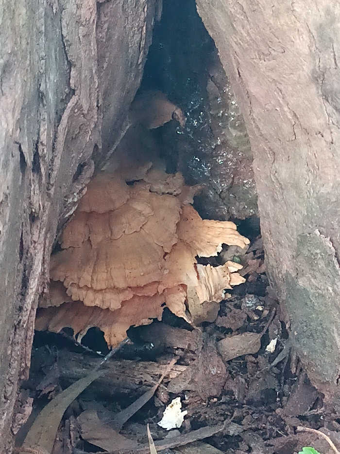 A cluster of shelf fungus grows within a tree's crevice. The layered, fan-like structures have a pale, peach-colored hue. The tree bark is rough and furrowed, forming the walls of the narrow space. Leaf litter and bits of decaying wood cover the base. Moisture glistens on the inner surface of the cavity above the fungus.