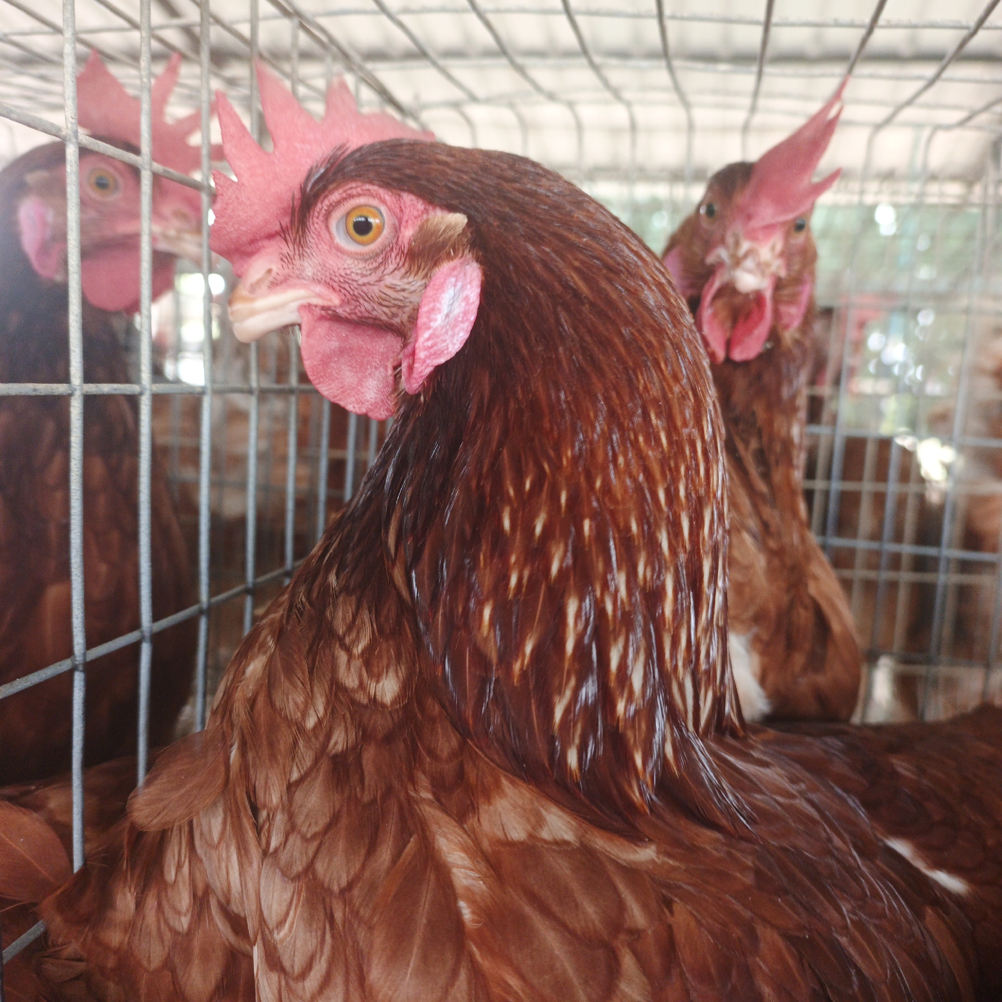 The image depicts multiple brown chickens confined in a wire cage