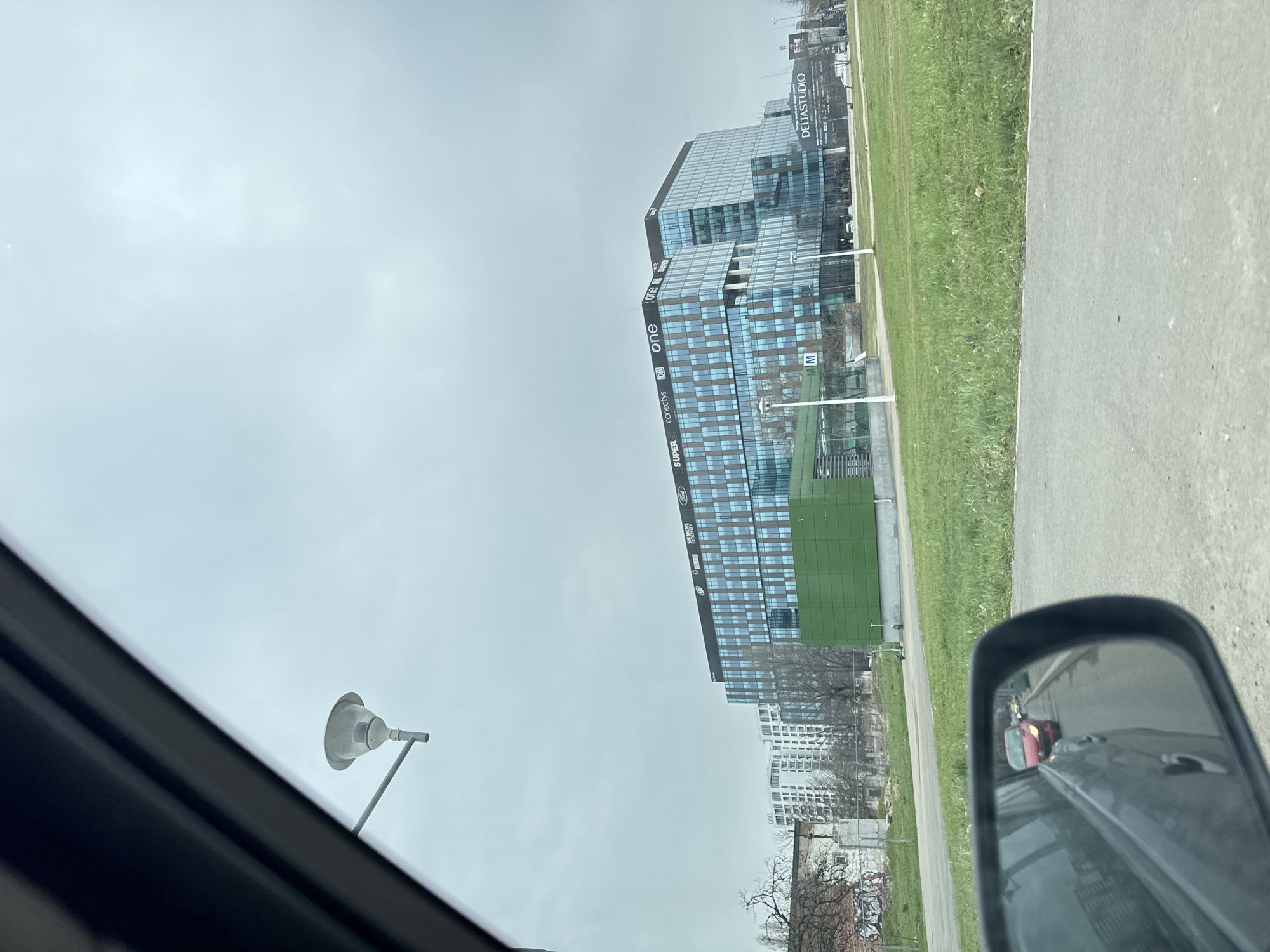 The image depicts an urban landscape in Bucharest, Romania, captured from inside a vehicle, looking through the passenger-side window. The sky is overcast and uniformly light grey. In the immediate foreground, the dark interior structure of the vehicle's frame partially obscures the top left. A street lamp with a light grey, bell-shaped fixture extends from the left mid-frame. The vehicle's passenger-side mirror is visible in the bottom left, reflecting a red car with its headlights illuminated, traveling in the opposite direction on an asphalt road. The midground features a strip of short green grass, indicating an urban median or park-like area. A bright green, rectangular structure with an "M" symbol, denoting a metro station entrance, is centrally located on the left side of this grassy area. Adjacent to it, a lime green and white shared electric scooter is parked on the grass. To the left of the metro entrance, an older, dilapidated building with exposed brickwork and graffiti is visible, separated by a wire fence. Behind this structure, several modern white residential high-rise buildings are present in the distance. Scattered bare deciduous trees are visible throughout the midground. The background is dominated by a large, multi-story modern office building with a blue-tinted glass and dark-framed facade. The building's roofline displays various company logos, including "ONE" (repeated), "SUPER" (repeated), "conectys," "DB," "SP," "SIEMENS ENERGY," and "FORD." To the right of this office building, a large billboard advertising "DELTĄSTUDIO" is visible. The specific location is identified as the area surrounding the One Cotroceni Park office complex, near the Academia Militară metro station, Sector 6, Bucharest, Romania. No individuals are visible in the scene. The bare trees suggest late winter or early spring conditions.