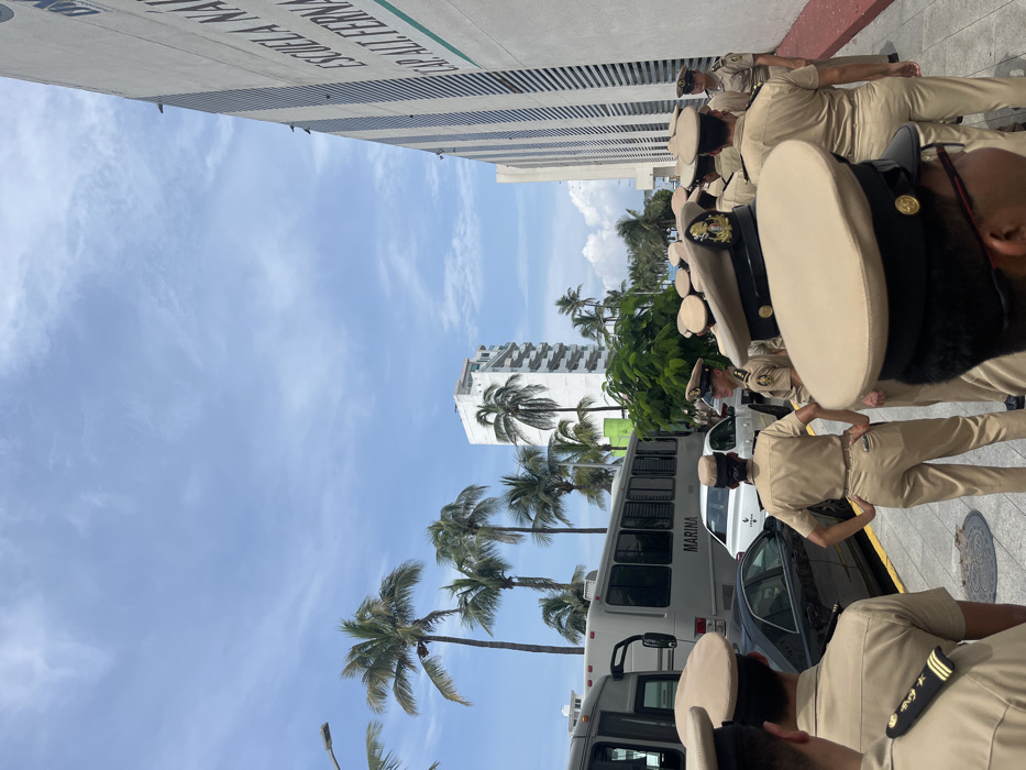 The image depicts an outdoor scene under a bright sky with scattered clouds in Veracruz City, Mexico. A group of approximately 10-15 individuals, primarily seen from behind or in profile, are gathered on a paved sidewalk. They wear light tan/khaki military-style uniforms, consisting of collared short-sleeved shirts, matching trousers, and peaked caps with dark bands and insignia. Shoulder boards with apparent rank insignia (e.g., three stars) are visible on some uniforms in the foreground. One female individual in the center foreground stands with hands on her hips, facing away from the viewer. To the immediate right, a large, modern building with a light-colored, vertically striped facade bears the partial inscription "ESCUELA NACIONAL DE INGENIEROS DE LA MARINA CAP. ALT. FERNANDO SILICEO Y TORRES," indicating the location as the National School of Marine Engineers. Along the street to the left of the group, a white passenger bus marked "MARINA" is parked, followed by a dark-colored sedan and a partially visible white sedan. Numerous tall palm trees are prominent throughout the mid-ground and background, and a multi-story white building is visible in the distance amidst the foliage, suggesting a coastal or tropical urban environment.