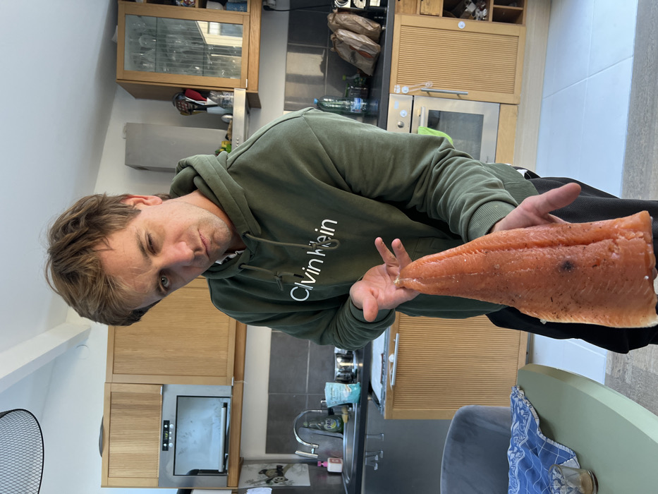 An indoor scene within a kitchen in Cachan, France, features a single male subject. The man, with light brown hair, is wearing a dark green hooded sweatshirt emblazoned with "Calvin Klein" in white text, and dark pants. He stands centrally, holding a large, raw, orange-pink salmon fillet horizontally with both hands, presenting it towards the viewer. The fillet shows dark specks of seasoning and a notable dark spot on its surface. The man looks directly at the camera, with his right eye partially closed in a squint or wink. The kitchen environment includes light wooden cabinetry with both horizontal and vertical slat patterns. On the left, a stainless steel sink with a chrome faucet is visible, flanked by a dark grey tiled backsplash. Adjacent to the sink are a bottle of dish soap, a white packet, and a metal pot. Above this area, a built-in appliance, likely a microwave or oven, with a digital display is integrated into the upper cabinetry. To the right, a stainless steel range hood is mounted above a stovetop area (partially obscured), and a stainless steel oven is visible below the counter. The countertop on the right holds a plastic water bottle and two brown paper bags. The floor is composed of large white tiles. In the lower left foreground, a section of a light green table is visible, adorned with a blue and white patterned cloth and a small glass, next to which a grey upholstered chair is partially observed. A dark, open-frame light fixture hangs partially visible from the white ceiling at the top of the frame.