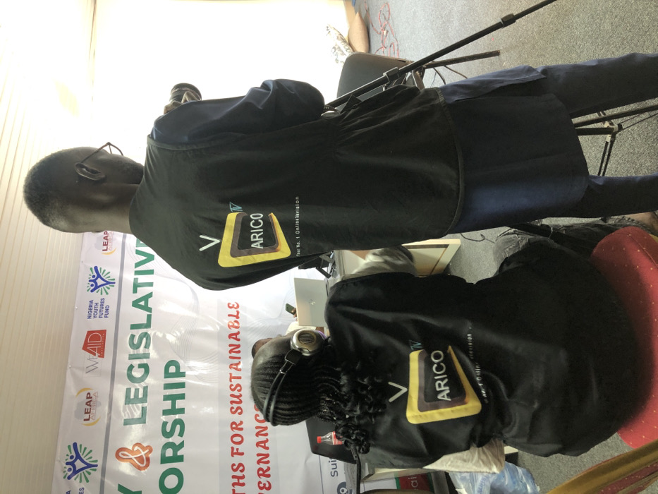 The scene depicts an indoor media production setup in Bauchi, Nigeria. In the foreground, two individuals are present, both wearing black vests featuring a yellow and black "ARICO TV Your No. 1 Online Television" logo. The person on the left is seated on a red upholstered chair, facing away from the camera, and wears silver over-ear headphones. To their right, a second individual stands, also facing away, wearing glasses, a dark tunic, and operating a professional camera mounted on a black tripod. In the mid-ground, a light-colored table is visible, holding at least two open laptops and a red Coca-Cola bottle. Other individuals are partially obscured behind this table. The background features a large white banner with the partial text "Y & LEGISLATIVE WORKSHOP" and "THS FOR SUSTAINABLE GOVERNANCE." Several organizational logos are displayed on the banner, including those for "LEAP Africa," "WVAID," and "NIGERIA YOUTH FUTURES FUND." The floor is carpeted in grey, and red electrical cables are visible on the right side of the frame.