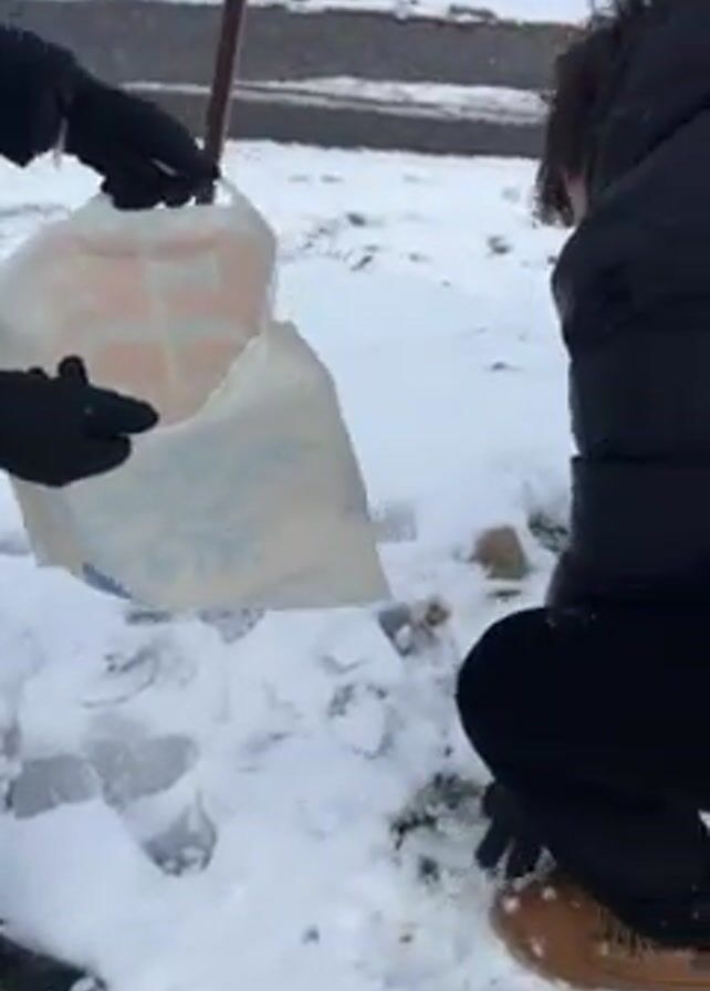 Two people are standing in the snow near a road. One person is holding a clear plastic bag open to reveal several red soda cans with white text inside. The second person is leaning toward the bag and then standing back up. The plastic bag is then tilted to dump the soda cans into the snow. The cans are then scattered in the snow. There are footprints in the snow and tree branches in the background. The road is visible in the background, and the sky is gray and overcast.