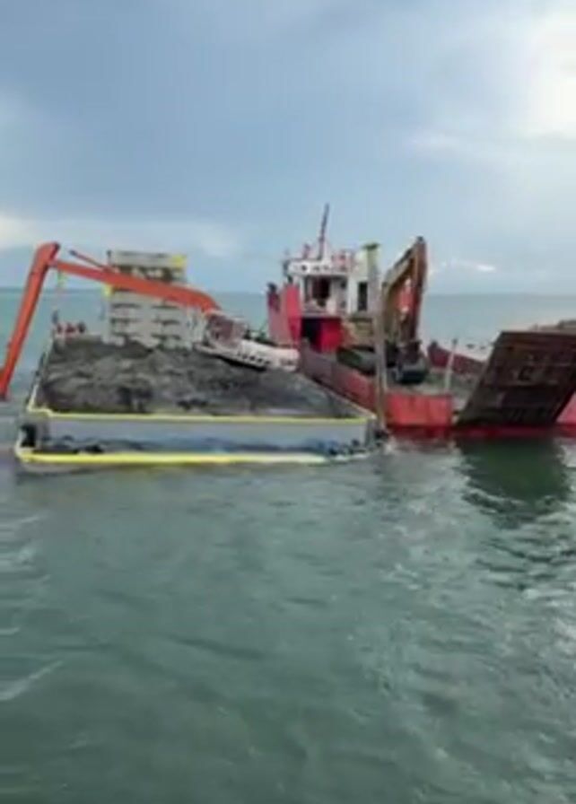 red and white barge in a body of water near a shoreline. The barge is loaded with dark, gravel-like material, some concrete blocks, and a white vehicle on top. Two excavators are visible on the barge, one orange and one yellow. A yellow containment boom surrounds the load. The water is slightly choppy. The sky is overcast. People can be seen working near the orange excavator. The barge appears to be carrying materials to the shore.