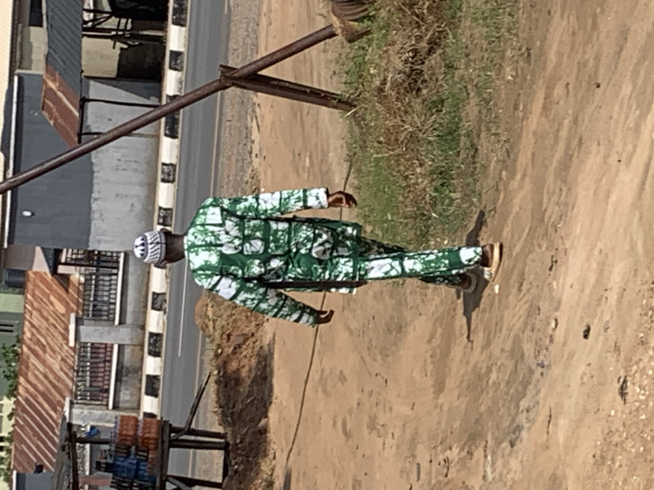 An individual, viewed from the back, walks leftward on a reddish-brown dirt path under bright daylight. The person wears a green and white patterned two-piece tunic and trousers, a white skullcap with a dark embroidered design, and light-colored slip-on shoes. A dark, elongated object is tucked into the back of their garment, extending above their left shoulder. To the immediate left, an earthen mound separates the path from a paved road featuring a white lane line and a black-and-white striped curb. On the left side of the road, a wooden stall displays stacked plastic bottles in orange crates. To the right of the path, patches of dry grass and a dark, angled metal pole structure are visible. In the background, across the road, several buildings are present, including one with a rusted corrugated metal roof, another with a grey wall, and a structure with a visible water tank on its roof. The scene is an unidentified roadside area, consistent with a semi-urban or rural setting.
