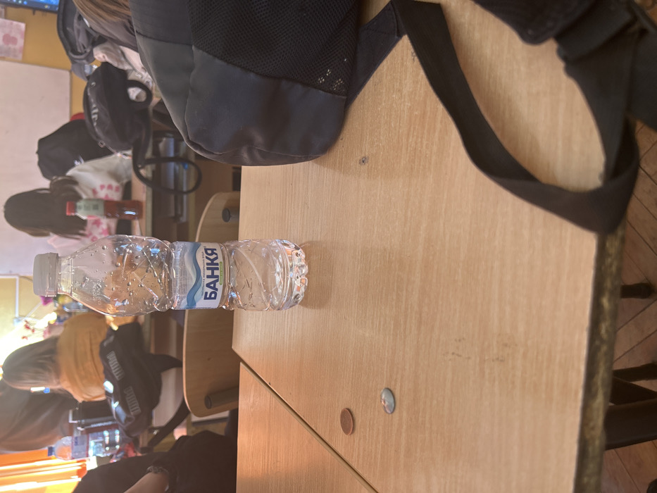 A classroom scene in Smolyan, Bulgaria, captured from a first-person perspective at desk level. In the immediate foreground, a black backpack's strap and part of its main body are visible on the right side of a light-colored wooden desk. Centered on the desk, a clear plastic bottle of Bankya natural mineral water, partially full and with condensation droplets, stands upright. To the left of the bottle, two coins rest on the desk: one copper-colored, and one silvery coin with an indiscernible design. In the mid-ground, multiple students are seated at similar wooden desks, facing away from the camera. The back of a student wearing a yellow/orange top is prominent on the left, with a black Puma backpack resting on their chair. Further back and to the right, another student in a white top with pink patterns is visible. A red-capped bottle and another water bottle are on their desk. Black backpacks are visible on or near other chairs. The background reveals a white board on the far wall and a glimpse of an electronic screen to the right. The overall lighting suggests an indoor, daytime setting with natural light entering from an unseen source.