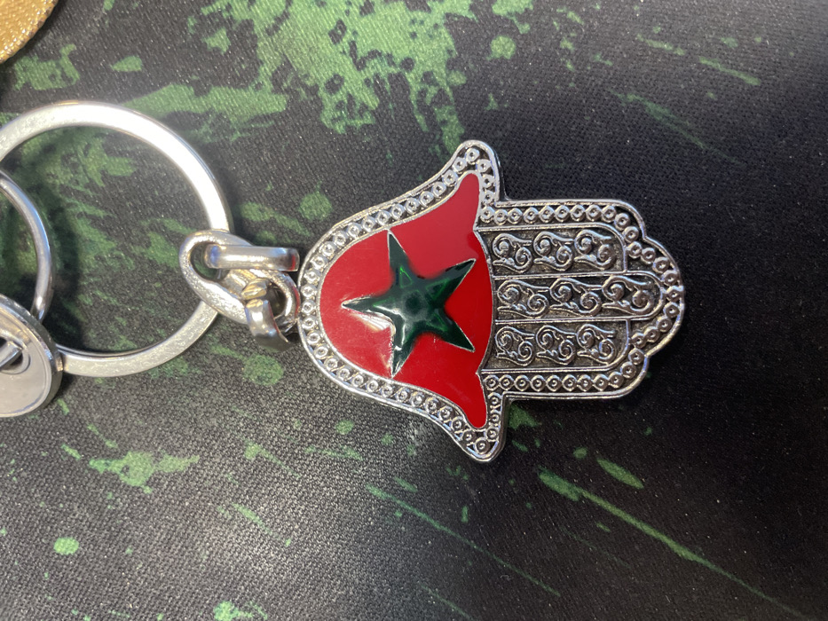 - "A close-up, top-down photograph taken in Montigny-le-Bretonneux, France, depicts a silver-colored metallic keychain featuring a Hamsa hand charm" by FM-yF0g73, licensed under CC BY 4.0