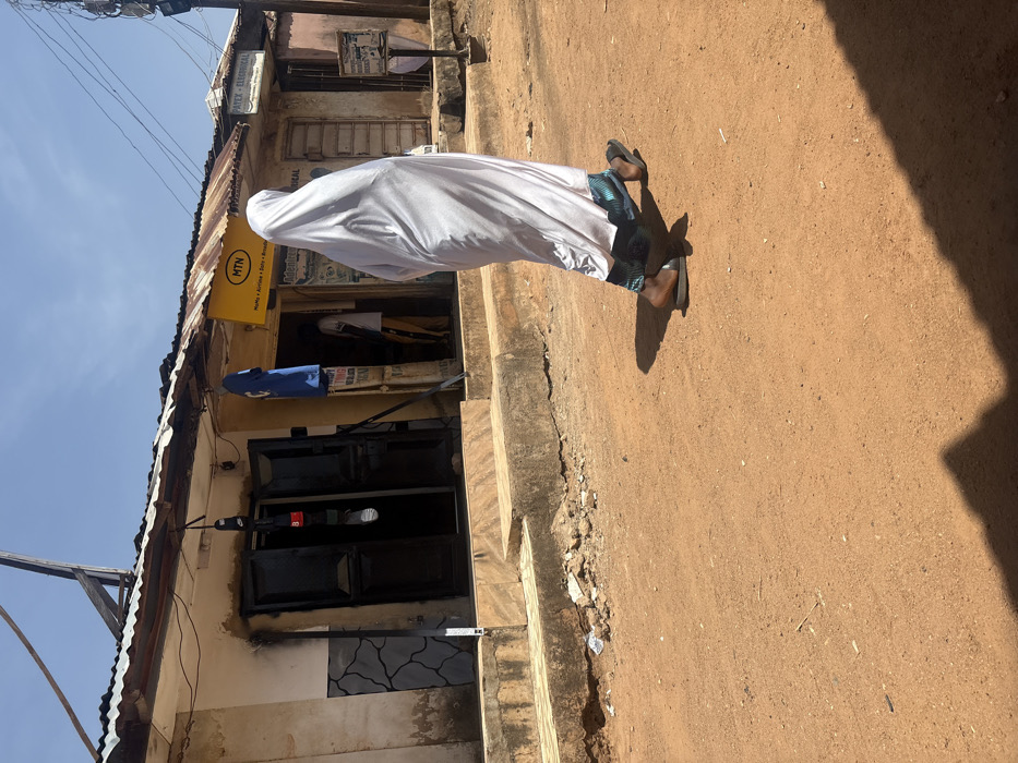 The scene depicts an unpaved, reddish-brown dirt road in a commercial area of Jos, Nigeria, under a clear, bright blue sky. In the midground, a person walks from left to right, facing away from the camera. They are mostly covered by a loose, light-grey or white full-length garment, with blue and black patterned trousers visible around their ankles. They wear black open-toed sandals, and their shadow is cast behind them on the dusty ground. A row of single-story commercial buildings lines the background, featuring weathered, light-colored walls and corrugated metal roofs. The building on the left has dark double doors, slightly ajar, revealing a dark interior. A dark, strap-like object hangs above this doorway. Adjacent to it, another shop displays a prominent yellow "MTN" sign, indicating services such as "Home • Airline • Data • Broadband." A blue garment hangs outside this MTN shop, and two indistinct figures are visible standing within its doorway. Further to the right, a different shop front has a white sign reading "PATEX - ELECTRICAL." Utility poles and overhead electrical wires are present on the right side of the frame. Scattered debris is visible on the ground near the building foundations.