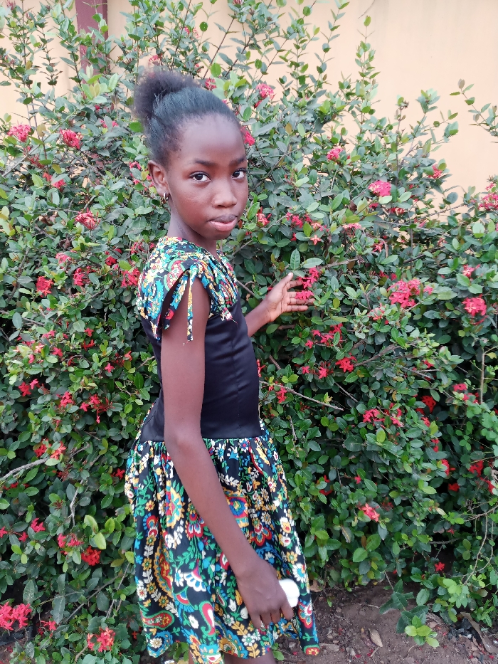 A young girl stands in front of a bush full of small red flowers, slightly turned to her right. She wears a colorful dress with black bodice and patterned shoulders, her dark hair pulled into a bun. She looks directly at the viewer with a serious expression. Her left hand rests against the flowers while her right hand holds a small white object. The backdrop is a pale wall and the ground is dirt.