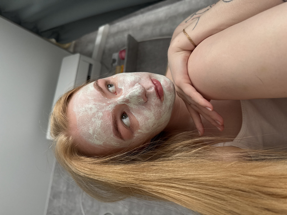 A single individual is photographed indoors, located in the city of Chaikovsky, Russia. The subject, identifiable by their long, light blonde hair, has a light-colored facial mask applied uniformly across their face. Their light-colored eyes are directed upwards and to the right of the frame. The individual wears a white tank top. Their right arm is bent, with the hand resting on the raised right knee. A thin, textured golden-colored bracelet is present on the right wrist, and a faint tattoo is visible on the upper right arm. The background features a light gray wall on the left, a white ceiling at the top, and a white wall-mounted air conditioning unit on the upper right. Below the air conditioner, a small shelf holds several small, multi-colored objects. A dark gray curtain is partially visible on the far right. The scene is illuminated by ambient indoor light.