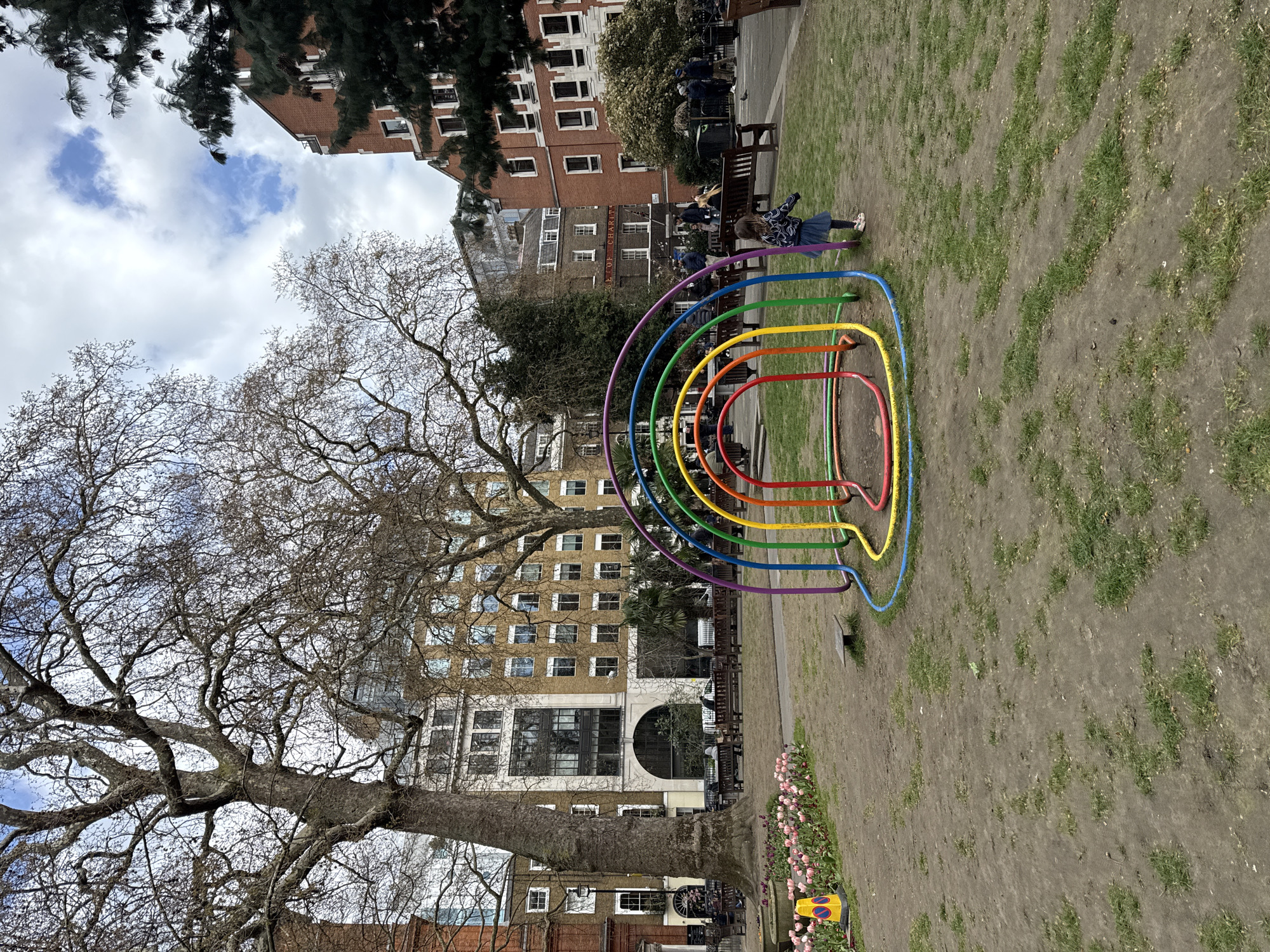 park scene in London. At the center is a play structure consisting of concentric metal arches painted in rainbow colors. A young girl wearing a blue jacket and skirt stands near the play structure. Several people are sitting on benches along a paved walkway. Various apartment buildings form the backdrop. The ground consists of patches of grass and bare earth. To the left is a large tree without leaves. A yellow and blue traffic cone stands on the lower right.
