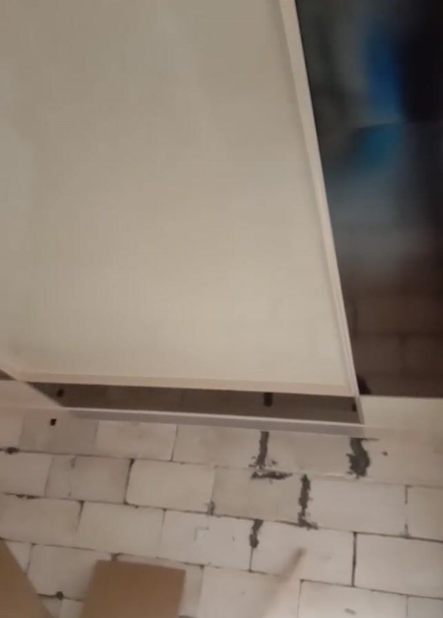 room being renovated. A light bulb hangs from the ceiling. The floor is covered in light-colored brick pattern tiles. A white wall borders the tiled floor. A closet or cabinet is partially installed along the wall. There is cardboard on the floor.