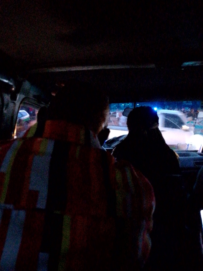 The image presents a low-light view from inside a vehicle, looking forward through the windshield into an urban street scene at night in the city of Unknown, Unknown. In the foreground, the back of a person's head and upper torso are visible, positioned on the right passenger side of the vehicle. This individual is wearing a garment with distinct horizontal stripes in shades of red-orange, yellow-green, and light blue. To their left, the silhouette of a second person occupies the driver's seat. Through the windshield, a street is illuminated by various artificial light sources, including a prominent blue light and multiple white lights emanating from streetlights or other vehicles. A light-colored vehicle, possibly white or silver, is discernible directly ahead and slightly to the right of the forward view. Indistinct shapes of additional vehicles and structures are visible in the distance. No specific actions or interactions are discernible beyond the seated presence of the individuals within the vehicle.