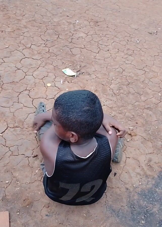 A young boy is sitting on the cracked, dry ground. He's wearing a black basketball jersey with white trim, and light-colored pants. He looks up at the camera, smiles, and gives a thumbs-up, holding a white ball in his lap. The ground is reddish-brown with many cracks, and there is a small piece of trash nearby. The camera is positioned directly above him.