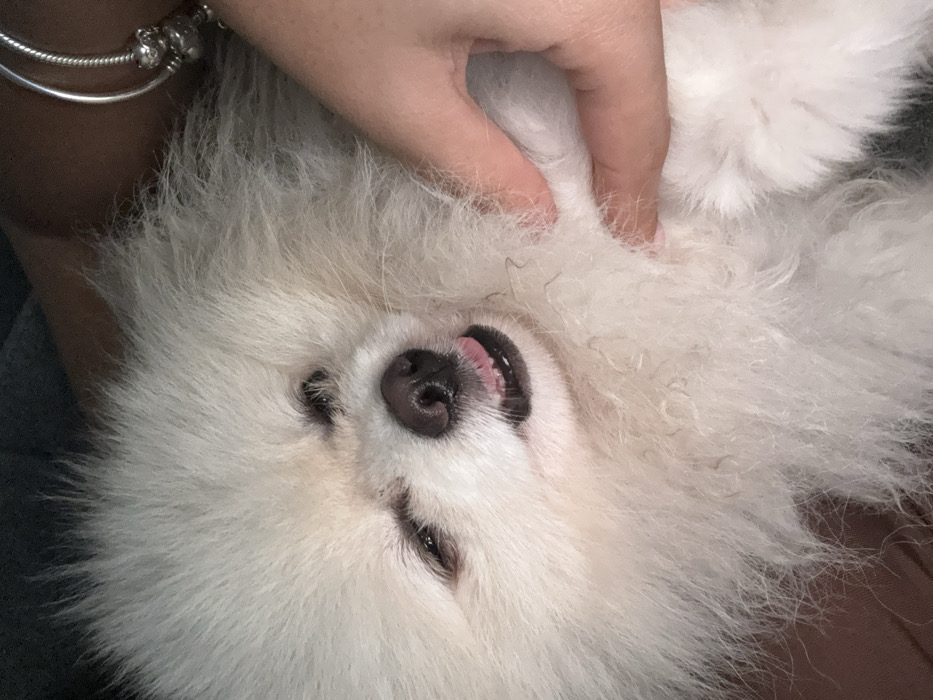 A close-up image depicts a small, fluffy white canine, likely a Pomeranian, with dense fur occupying the majority of the frame