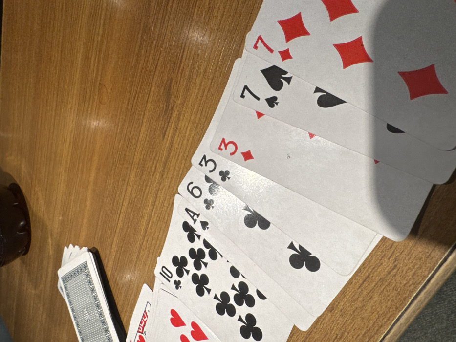 - "An elevated, downward-angled forensic photograph captures a hand of playing cards fanned out on a polished, light brown wooden table with visible grain" by FM-NYNCJ2, licensed under CC BY 4.0