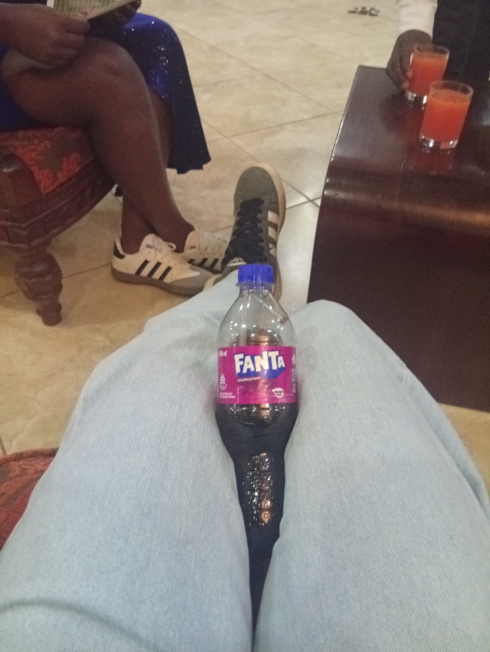A first-person perspective shows a bottle of Fanta blackcurrant resting between the thighs of someone wearing light blue jeans. The person also wears two different Adidas sneakers. In the background, a person sits on a reddish upholstered chair, wearing a blue, sequined garment. A small dark brown table holds two glasses of orange liquid. The flooring is tiled.