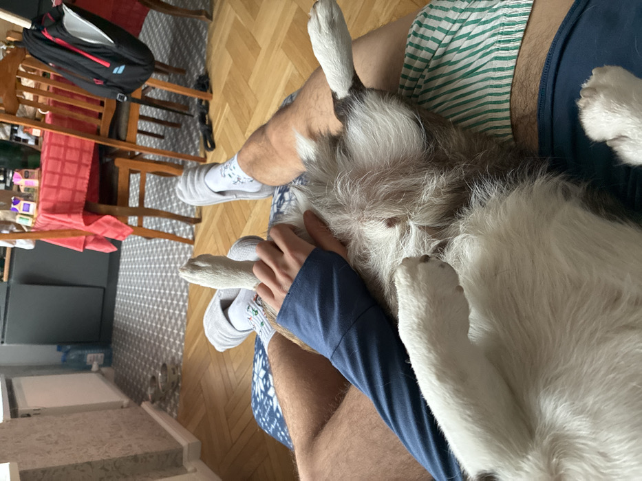 The image provides a first-person, downward-angle perspective within a residence in Tbilisi, Georgia. A person's bare legs are visible, the left leg clad in blue patterned pajamas with white snowflakes, and the right leg in green and white striped shorts. Both feet are wearing light grey slippers and white socks. A medium-sized, bi-colored dog, with white and grey/brown fur, lies inverted across the person's lap, its abdomen and paws facing upwards. Multiple nipples are visible on the dog's belly, consistent with a female. A human hand, covered by a blue long-sleeved garment, gently rests on the dog's chest/neck area. The immediate flooring is light brown wooden parquet, which transitions to a grey and white geometrically patterned tile floor in the background. The tiled area displays a dark grey refrigerator, a large blue water dispenser bottle, and two ceramic pet bowls. Adjacent to the tiled area, on the parquet, a wooden dining table covered with a red and white checkered tablecloth is surrounded by wooden chairs. Various small containers, including one purple-colored, are visible on the table surface. A black backpack with red accents hangs from one of the wooden chairs. A black elongated object rests on the parquet floor near the base of the chairs. The walls are light-colored, with a textured wallpaper pattern visible on the left, where a white radiator is also mounted.