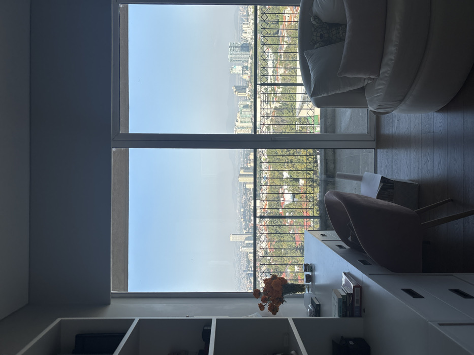 The image depicts an interior room, likely a high-rise apartment or condo, with a panoramic view of Mexico City, Mexico