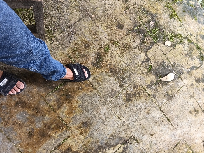 The scene depicts a high-angle view of an individual's lower legs and feet on a weathered outdoor paved surface, located in the city of Unknown, Vietnam. The person wears blue denim jeans and black, open-toed sandals with white-striped, adjustable Velcro straps. The feet are positioned on a ground composed of irregular, light-grey to brown flagstones or concrete tiles. This paving displays extensive discoloration from dark, damp patches and abundant green moss or algae growth within its crevices and on the surface. Scattered debris includes several small dry twigs and two light-colored, dried leaves. A dark, rectangular structure, possibly a wooden or concrete step, is partially visible in the upper left corner of the frame.
