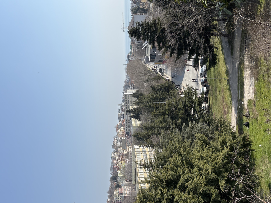 This image presents an elevated panoramic view of a section of Varna, Bulgaria, overlooking the city from what appears to be the Sea Garden (Morska Gradina) towards the Black Sea. The scene is observed under a clear, light blue sky. In the immediate foreground, a grassy slope, predominantly green with some brown patches, descends towards the midground. Two individuals are seated on this slope in the lower-left quadrant, facing away from the viewer, while a third is less distinct to their right. Pine trees with dense green foliage occupy the left side of the foreground and extend into the midground, forming a significant treeline. On the right, bare-branched deciduous trees suggest a non-summer season. The midground features a multi-lane paved road, likely Tsar Osvoboditel Blvd, curving and descending from the upper-right towards the lower-left. A white public transit bus travels down this road. Numerous pedestrians are visible walking along the sidewalks, primarily on the left side of the road. Several cars are parked along the right edge of the road and in an adjacent small parking area. A red circular road sign is visible next to the parked vehicles. Architectural structures include a prominent, multi-story building with a light-colored facade and numerous windows on the mid-left, partially obscured by trees. Other urban buildings with modern designs are visible along the road's right side. The background reveals a dense cityscape of Varna, with various residential and commercial buildings, displaying a mix of pastel and neutral colors on their facades, covering the undulating terrain. On the far right, the dark blue expanse of the Black Sea is visible on the horizon, punctuated by at least two large construction cranes near the coastline, indicating ongoing development.