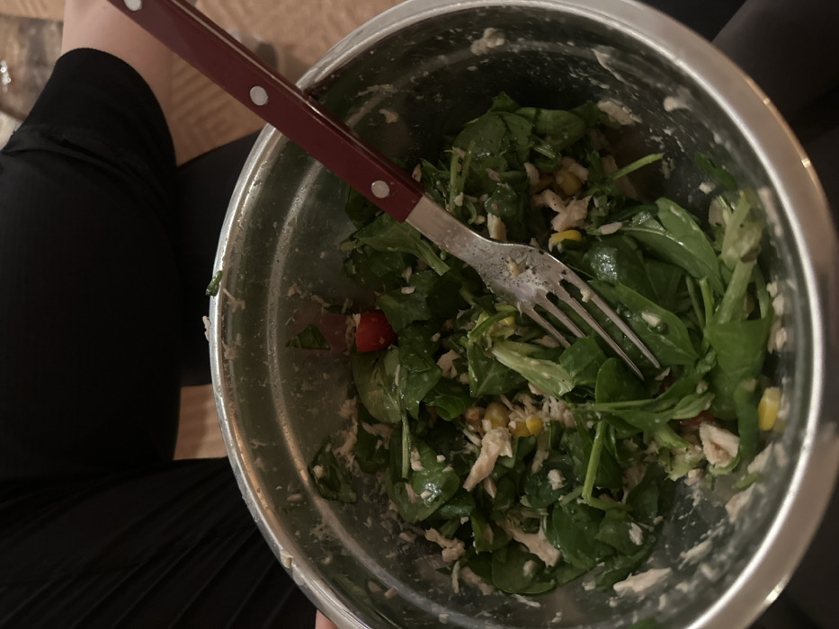 A stainless steel mixing bowl, approximately two-thirds full of salad, is presented from an overhead perspective. The salad consists primarily of dark green leafy vegetables, shredded light-colored protein, yellow corn kernels, and small red tomato pieces, all coated in a creamy dressing. A silver-colored fork with a dark red handle, featuring two visible silver rivets, rests embedded in the salad. The bowl is being held by a person whose left leg, clothed in black fabric, is partially visible in the upper sections of the frame, along with a portion of a light-skinned hand on the left supporting the bowl. The background shows a light-colored wooden floor with a parquet pattern, indicating an indoor setting. The specific urban location within Paris, France, cannot be determined from the available visual information.