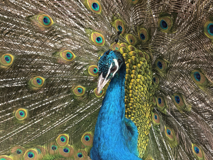 - "A male Indian Peafowl (Pavo cristatus) is depicted in a close-up, centered view, with its iridescent train feathers fully fanned and prominently displayed" by FM-QK5pm1, licensed under CC BY 4.0
