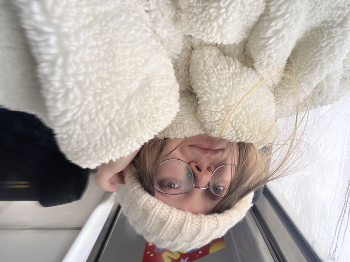 A close-up, chest-up image depicts an individual, appearing female, with light-colored hair and fair skin, looking directly at the camera with a neutral expression. She is wearing round, thin-framed glasses, a cream-colored knitted beanie, and a cream-colored, textured, fluffy jacket or blanket. Her left hand is partially visible, positioned near her temple, touching the beanie or hair. The background indicates an indoor environment, possibly a moving vehicle, with a window on the left showing streaks of condensation or precipitation. A dark-colored object, potentially a seat, is visible in the upper right background, and a small, colorful detail with yellow, red, and blue elements is present above the window on the right. The specific location within the city of Борисово, Russia, cannot be ascertained from the visual evidence provided.
