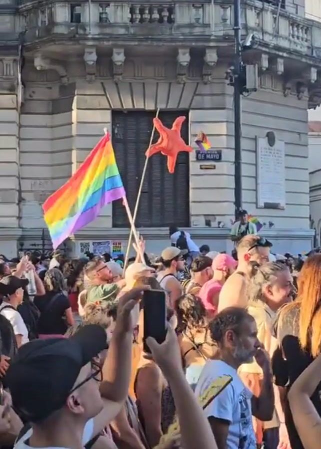 crowd of people gathered on a city street, likely participating in a LGBTQ+ event