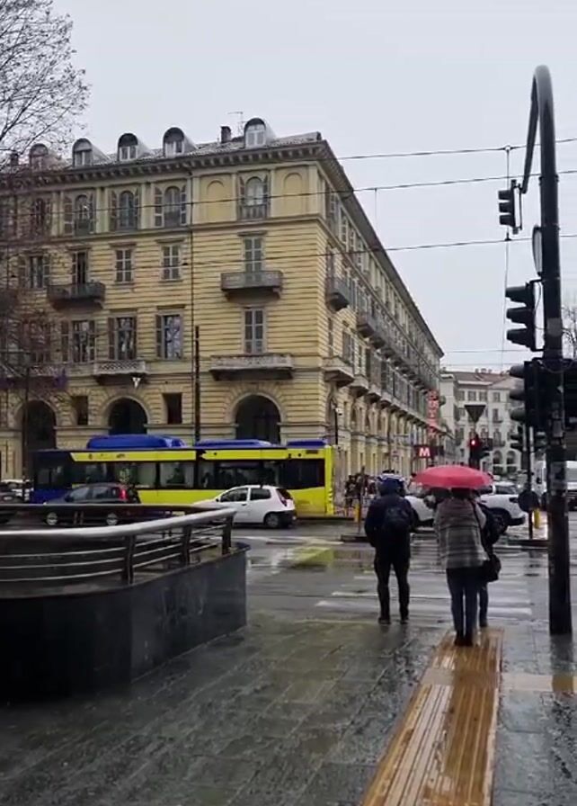street scene on a rainy day. Three pedestrians stand on a sidewalk waiting to cross the street. One holds a red umbrella. A yellow building with arched windows and balconies stands on the corner. Buses and cars drive by on the wet road. Traffic lights hang above the street. A metal railing and the entrance to an underground station are visible. The sky is overcast and grey.