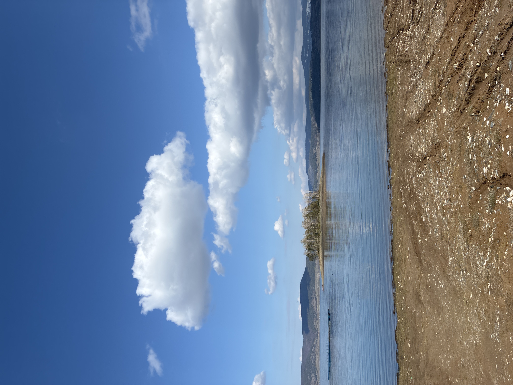 The image depicts a panoramic landscape taken at the Цигов чарк reservoir in Bulgaria, under a partially cloudy blue sky. The foreground consists of a reddish-brown, muddy shoreline with scattered light-colored pebbles and prominent tire tracks. The water, which occupies the midground, is a calm blue-grey with visible ripples reflecting the sky. In the mid-distance on the water, a cluster of blue rectangular floating structures is visible on the left. To the right, an irregularly shaped landmass, possibly an island or peninsula, features a dense group of deciduous trees, currently bare-branched, and a small, reddish boat or object near its bank. The background shows undulating hills and mountains, some with visible snow patches, receding into the distance under the sky. There are no individuals present or explicit actions depicted.