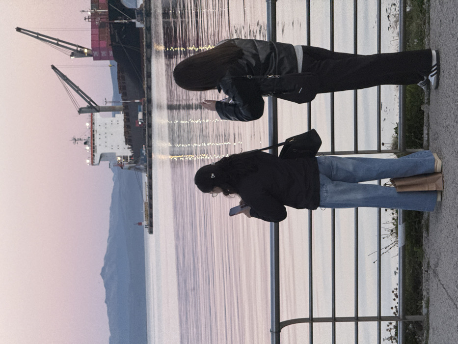 The image presents a forensic view of a waterfront scene in Ushuaia, Argentina, during twilight hours, characterized by a pinkish-purple sky. Two female individuals are observed from behind, standing on a concrete promenade and leaning against a multi-bar metal railing. The individual on the left has dark hair with two white clips, wears glasses, a dark jacket, light blue wide-leg jeans, and light-colored footwear. She holds a smartphone vertically with both hands, pointed towards the water and distant objects. A black shoulder bag hangs on her left side, and a brown paper shopping bag rests on the ground between her feet. The individual on the right has long dark hair, wears a dark jacket (possibly leather), dark pants, and white-striped Adidas sneakers. She holds a smartphone horizontally with both hands, also directed towards the water. A black crossbody bag is visible on her right side. In the midground, a large dark-hulled cargo or container ship with a white superstructure is docked at a pier on the right. The ship is equipped with two prominent cranes and shows stacked shipping containers, some appearing pinkish-red. To the left of the main dock, a small red and white navigational beacon or lighthouse stands on a smaller pier section. The water surface reflects lights from the ship and dock infrastructure. Distant, hazy mountains are visible across the water under the colorful sky.