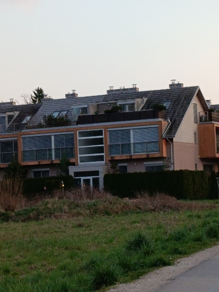 The image displays a residential building complex located in Ljubljana, Slovenia, viewed from an unkempt grassy area. The complex consists of multiple interconnected units with grey tiled, pitched roofs, featuring numerous chimneys and skylights. The prominent structure in the mid-ground has a modern facade, characterized by large windows framed in light brown/orange, equipped with horizontal blinds. A central section of this facade contains a tall, multi-paned window without blinds. A white double-door entrance, marked with the number "13" above, is centrally positioned. The lower part of the building, partially obscured by a dark green, manicured hedge, exhibits a light peach-toned exterior. Balconies or terraces with dark railings are visible on upper levels. The foreground comprises a mix of green grass and dry, brown vegetation, with a narrow paved edge along the bottom right. A single, dimly illuminated light fixture is present within the hedge near the entrance. A conifer tree is visible behind the building on the left. No individuals or discernable actions are present. The sky is light and clear, suggesting ambient natural light.