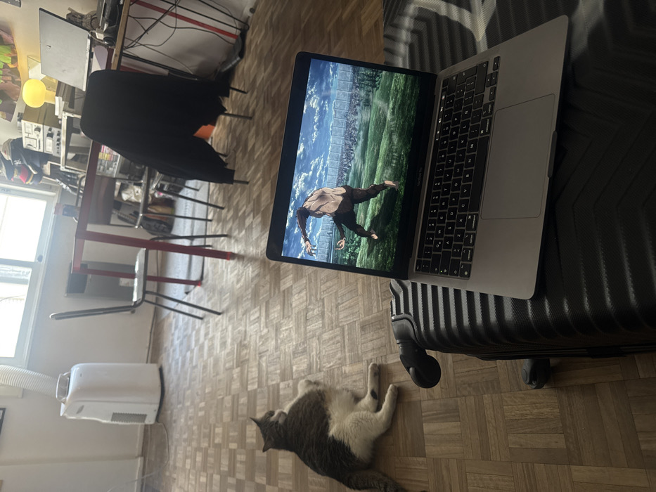The scene depicts an interior room, likely an apartment, with light-colored walls and light-brown parquet flooring. In the left foreground, a domestic shorthair cat, grey/brown tabby with white markings, lies on its side on the floor, facing left. In the center foreground, a silver MacBook Pro laptop is open and resting on a black, horizontally-ridged hardshell suitcase. The laptop screen displays an animated scene of a large, muscular, skinless human-like figure running in a green field towards a distant walled city under a blue sky with clouds. In the mid-ground, to the left, a white portable air conditioner unit with a visible exhaust hose is positioned near a window. A red-framed table with a dark top and two chairs are visible further back; a dark jacket is draped over one of the chairs. To the right, a cluttered desk or shelving unit holds various objects, including what appears to be audio equipment and a yellow spherical lamp. Natural light enters from the window. The image provides no specific visual cues to identify a precise location within Buenos Aires, Argentina.