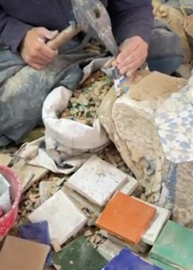 A person is seated cross-legged on the ground, surrounded by piles of colorful ceramic tiles and fragments. They are using a hammer and a small chisel-like tool to break a small piece of a white tile into smaller fragments. These fragments are being added to a bag already filled with similarly sized pieces. The person is wearing dark clothing. The setting appears to be a workshop or studio. The environment is dusty and cluttered.