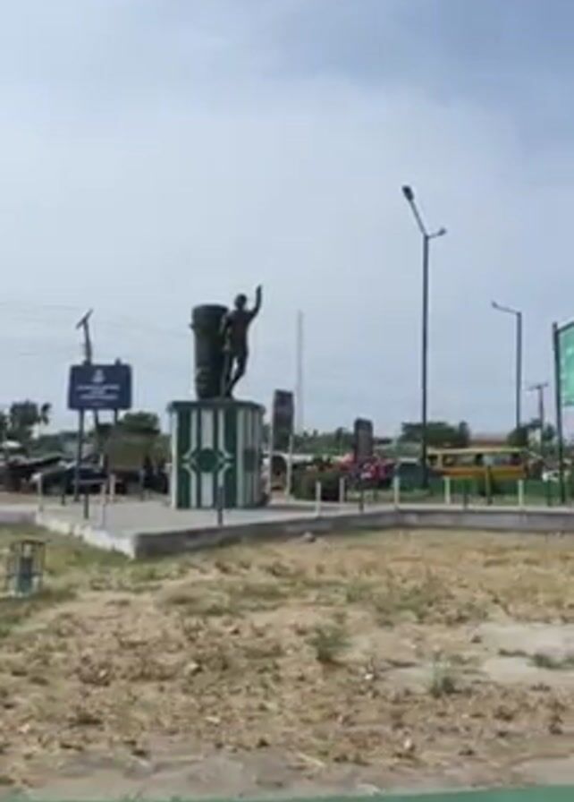 The video presents a distant shot of a statue standing at a roundabout. The statue is of a human figure with one arm raised. It rests atop a structure painted with alternating green and white stripes. Behind the statue, there is signage and a collection of vehicles parked. The surroundings appear to be a public space with visible roads, streetlights, and additional signage. The ground surrounding the statue is mostly dry grass and concrete. The sky above is overcast.