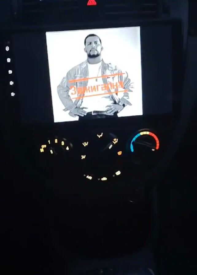 dashboard of a car as it drives down an open road. The dashboard includes a radio playing music, a temperature gauge, and other controls, all illuminated. The view through the windshield shows a flat, empty road with a cloudy sky. The video seems to have been taken from the driver's perspective.
