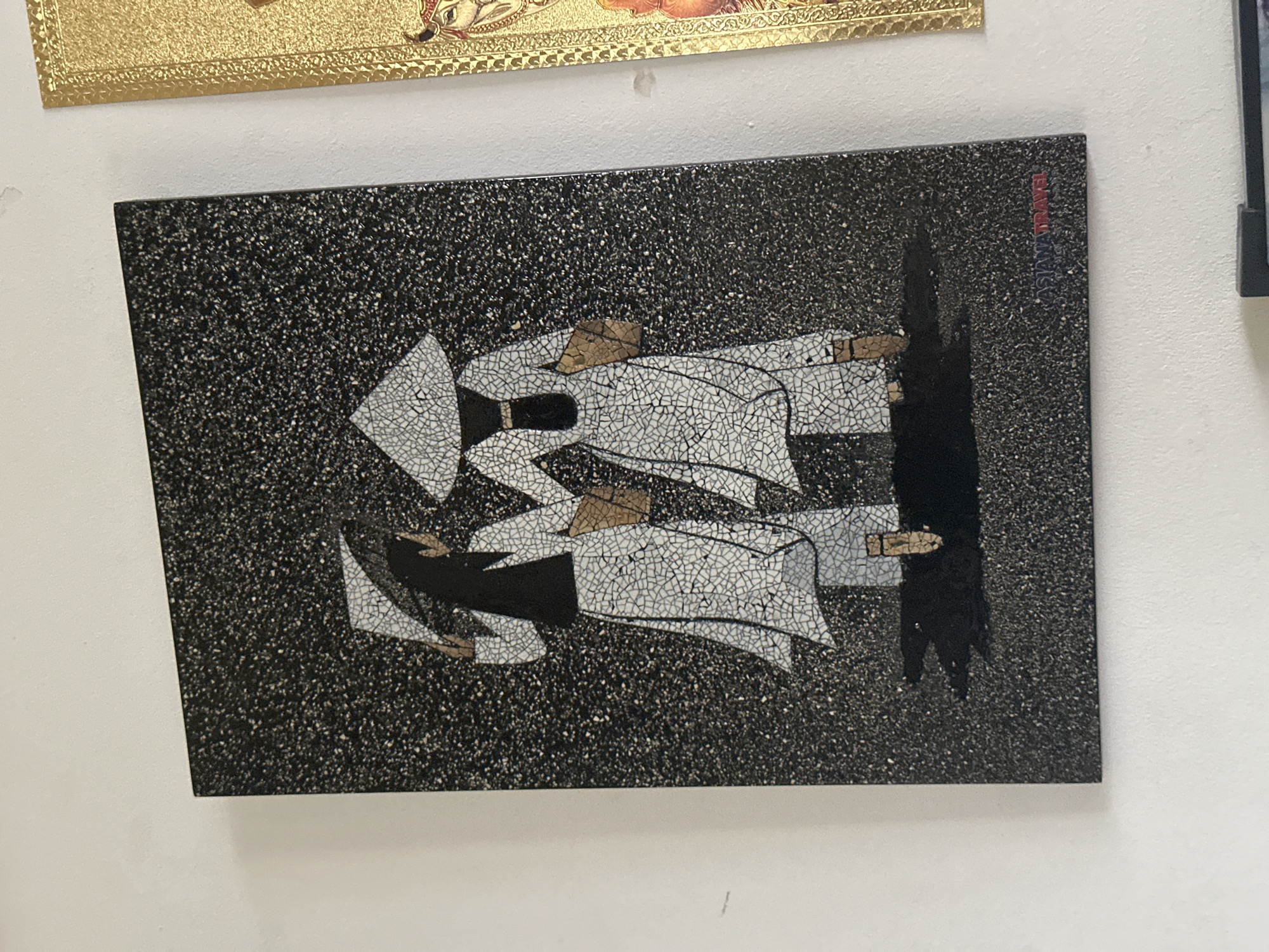 The image displays a rectangular art piece, likely a mosaic or a mosaic-style print, affixed to a plain white wall