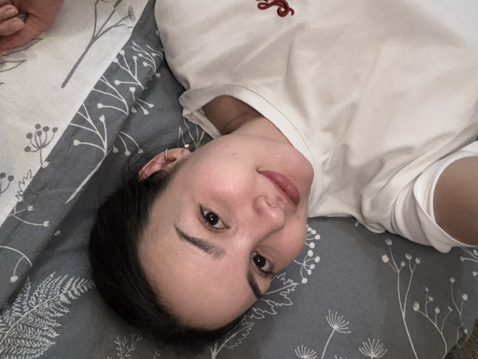 The scene depicts a young adult female positioned horizontally, presumably lying down, within an indoor environment identified as the city of Bayronovka, Russia. The individual has dark hair pulled back from her face, dark eyes, and fair skin, with a faint smile directed towards the camera. She is wearing a light-colored (likely white or off-white) short-sleeved t-shirt featuring a red embroidered design on the right side of her chest, resembling stylized lettering. A small gold-colored hoop earring is visible on her right earlobe, and another small stud earring is present on the upper cartilage of the same ear. She is resting on bedding characterized by a dark grey background with a repeating pattern of white or light-colored botanical elements, including fern fronds and dandelion-like structures. In the upper right corner of the image, a light-skinned hand, possibly belonging to the depicted individual or another person, is partially visible.