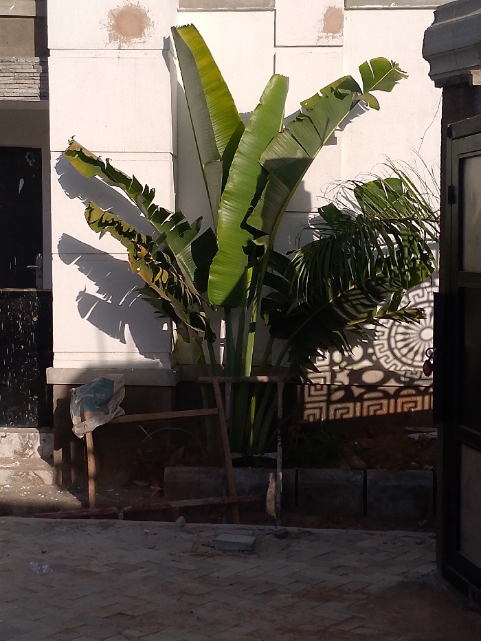 This image depicts an outdoor scene at a building exterior in Kwang, Nigeria, illuminated by strong direct sunlight. The background features a cream-colored building wall with a pattern of recessed rectangular panels, showing some minor surface discoloration on the upper left. To the far left, a darker section of the building with a dark door or window frame is visible. To the right, a dark metal gate is partially open, revealing a decorative screen with a circular and geometric pattern that casts distinct shadows on the ground. In the midground, a large plant with prominent green, paddle-shaped leaves, possibly a banana plant or Traveler's Palm, stands against the wall. Some leaves exhibit minor tears. To its right, a smaller, dark green palm-like plant is present. Both plants are rooted in a raised garden bed containing dark soil, bordered by grey concrete blocks. A rudimentary wooden frame or support structure is positioned in front of the large plant, and a white sack is draped over its left side. The foreground consists of a reddish-brown brick paver pathway laid in a herringbone pattern. A single small grey concrete block rests on the pathway. Shadows from the foliage are sharply cast on the left wall and ground, indicating a light source from the right. No people are visible. The scene suggests an outdoor area, possibly residential, with elements indicative of landscaping or construction activity.