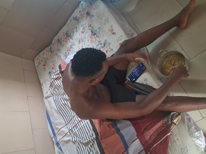 A young adult male is observed in an indoor room within Ihiagwa, Nigeria. He is seated on the edge of a bed, shirtless, wearing dark shorts, and has short, dark, curly hair. He is leaning forward, looking down. In his left hand, he holds a silver-colored pot containing noodles, into which a fork is inserted. A dark smartphone with an illuminated screen displaying various application icons rests on the bed beside his right thigh. The bed is covered by two distinct bedspreads: one featuring horizontal stripes in blue, white, red, and black, and another with a floral pattern of light pink and green on a pale background. The room's walls are partially covered with light-colored square tiles, and the floor is also comprised of light-colored tiles.