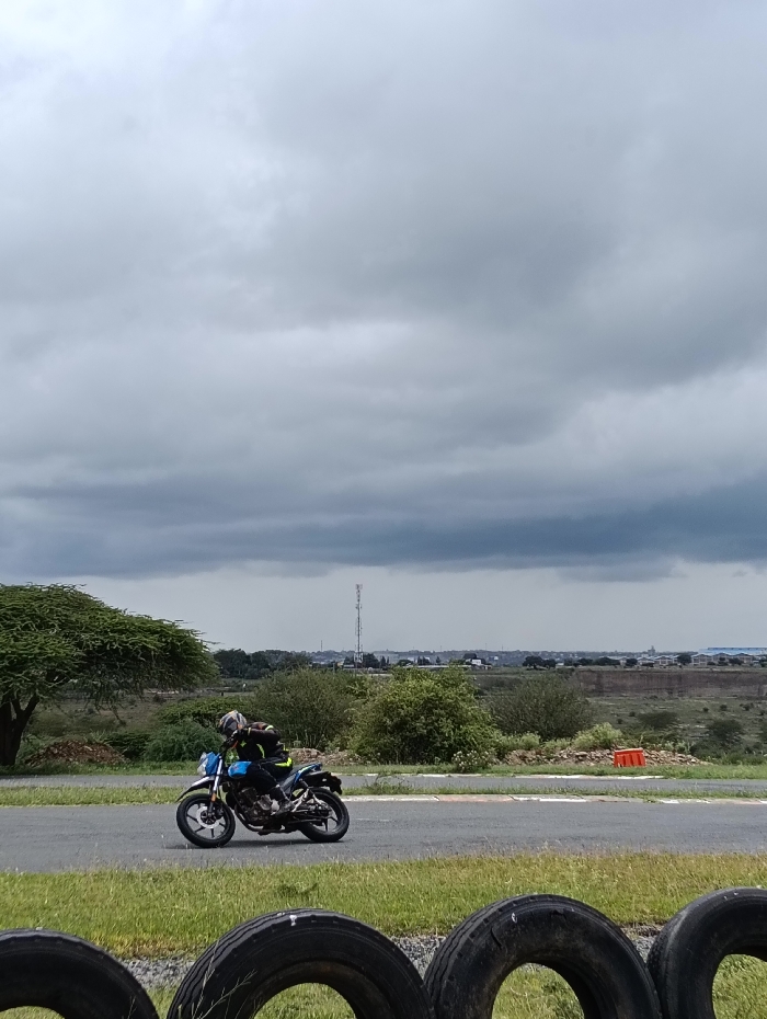 The image depicts an outdoor scene in Matathani ward, Kenya, under an overcast sky filled with dense grey clouds. In the mid-ground, a paved asphalt track extends horizontally across the frame. A single individual, dressed in full protective motorcycle gear including a dark jacket with light accents, dark trousers, and a full-face helmet with a clear visor, is riding a blue and black motorcycle from left to right on the track. The rider is leaning into what appears to be a turn. To the immediate left and right of the track, green grass is visible. In the foreground, along the bottom edge, three dark, worn tires are positioned horizontally, partially cropped, likely forming a barrier. The background features a rural or semi-urban landscape with scattered green trees and bushes. A prominent, tall, white cellular communication tower stands vertically in the center-right background. Further in the distance, a horizon line reveals faint structures and buildings, suggesting a populated area, along with a long, low concrete wall-like structure on the right side. An orange pylon or marker is visible on the right side of the track, further down from the motorcycle.