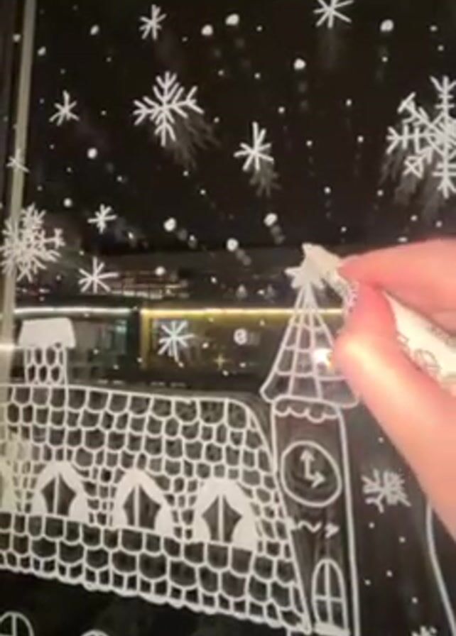 person drawing on a black window with a white marker. The drawing depicts a winter scene with snowflakes and a building that resembles a clock tower. The background shows a blurred view of a street at night with lights. The person's hand and part of their arm are visible as they draw on the window.