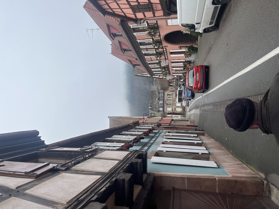 An overhead-view photograph captures a street scene in Châtenois, France, under an overcast sky
