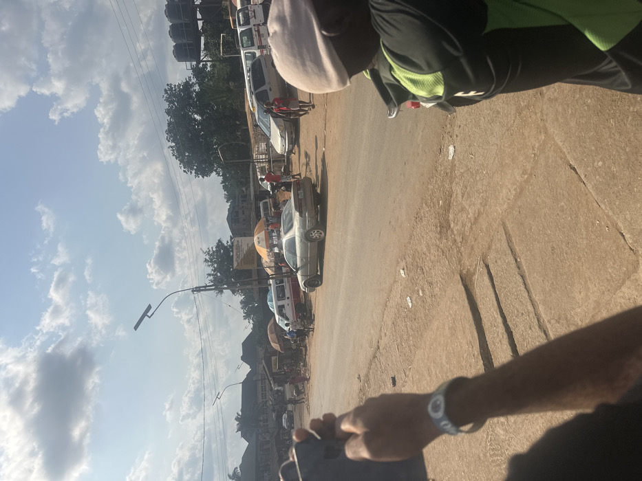 The image depicts a street scene in Igbo Ukwu, Nigeria, observed on a bright, partly cloudy day. In the immediate foreground on the left, a person's arms are visible, holding a dark-colored smartphone vertically, pointed towards the street. A white wristband is present on the left wrist. On the right foreground, the back of a person wearing a light-colored cap and a black shirt with lime green accents is partially visible, facing away from the camera. The mid-ground features a paved road, appearing dusty, with unpaved, reddish-brown dirt shoulders on both sides. A light-colored sedan, possibly silver or beige, is positioned on the right side of the road, facing away from the viewer. Further down the road, a white van with a red stripe is visible on the left, situated under an orange market umbrella. Additional vehicles, including another white van and a silver minivan, are parked or moving further into the scene on the right. Multiple individuals are present along the road shoulders, particularly on the right, some standing and others walking. Several market-style umbrellas in shades of orange, red, and white are spread across the scene, providing shade. A tall streetlight pole with a solar panel and an LED fixture stands prominently on the left side of the road; another similar pole is visible in the background. The background consists of various buildings, including what appear to be single-story market stalls and multi-story structures. Green trees and dense foliage are present behind the buildings. On the far right, a structure supporting multiple dark-colored water tanks is visible against the sky. The sky above is a clear blue with scattered white cumulus clouds.