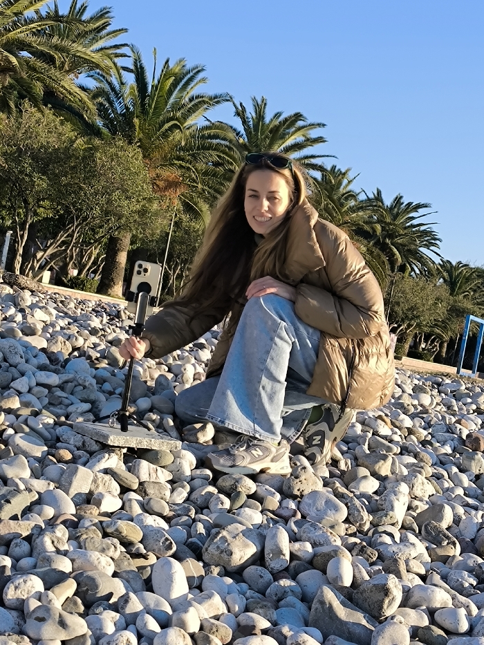 A lone adult female is depicted crouching on a pebble beach in Bar, Montenegro, under a clear blue sky. She has long brown hair, wears a brown puffer jacket, light blue wide-leg jeans, grey athletic shoes, and sunglasses pushed onto her head. She smiles while looking towards the viewer. Her right hand holds a black extendable monopod supporting a light-colored smartphone, which rests on a flat grey stone slab placed upon the pebble-covered ground. The immediate foreground and midground consist of various smooth, rounded pebbles. The background features several tall palm trees and green shrubbery. A blue-framed structure is partially visible on the far right.