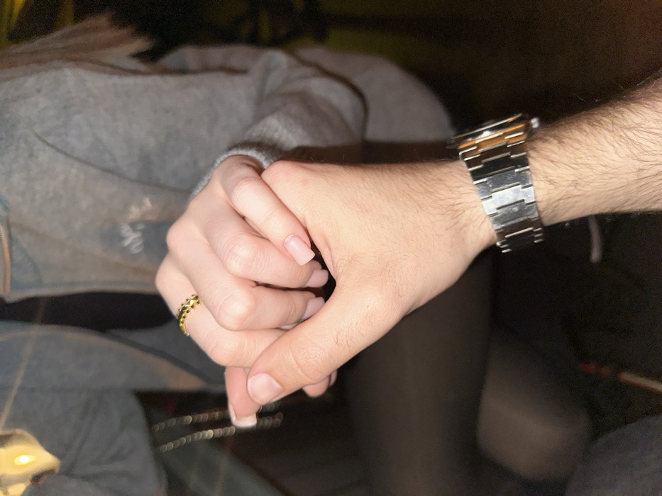 The image displays a close-up view of two individuals' hands interlocked, situated in what is understood to be the city of Sofia, Bulgaria, although the specific location within the city is not discernible from the visual evidence. One hand, identified as a left hand by the ring placement, has light skin, neatly trimmed fingernails with a light pink/nude polish, and wears a gold-colored patterned ring on the ring finger. This individual is partially clothed in a grey, long-sleeved garment, possibly a hoodie or sweatshirt, with a dark strap or chain partially visible near their left shoulder. The second hand, identified as a right hand, exhibits a slightly darker skin tone with notable hair on the forearm, and wears a metallic wristwatch featuring a silver-colored link bracelet and gold-colored accents. This hand is clasped around the first individual's hand, with fingers interlocked. The environment is dimly lit and out of focus, suggesting an indoor setting. A blurred light source is present in the upper left quadrant of the image.