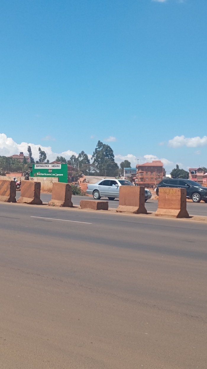 A road with concrete barriers divides the foreground, leading to a scene with a green sign reading "Gatuguta's House" and "Salaricom Mpesa." Cars are driving on the opposite side of the road: a silver car and a black SUV are prominent. Buildings and trees populate the background under a clear, blue sky with scattered clouds. The scene depicts a roadside view with local advertisements.