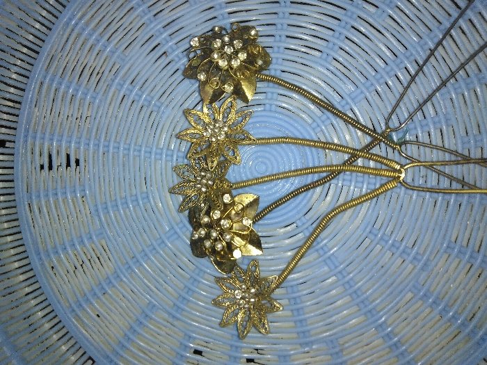 The image displays five decorative hairpins or ornamental jewelry pieces placed on a light blue and white woven plastic surface