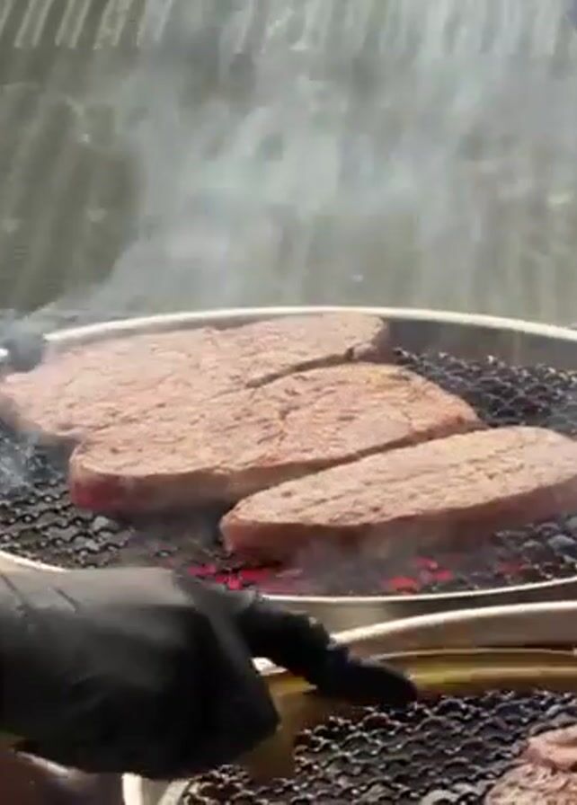 A close up shot shows three pieces of meat being cooked on a metal grill. The grill is circular and placed over red hot coals. Someone wearing black gloves uses tongs to move a lower grill and adjusts meat with their gloved hand. Steam rises from the cooking meat. The background is blurry and seems to be in an outdoor setting.